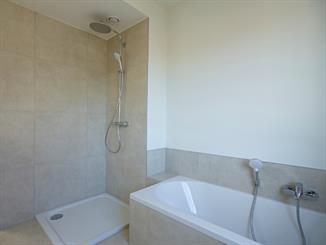 Lichtrijke badkamer met dubbel lavabomeubel , bad en grote douche.